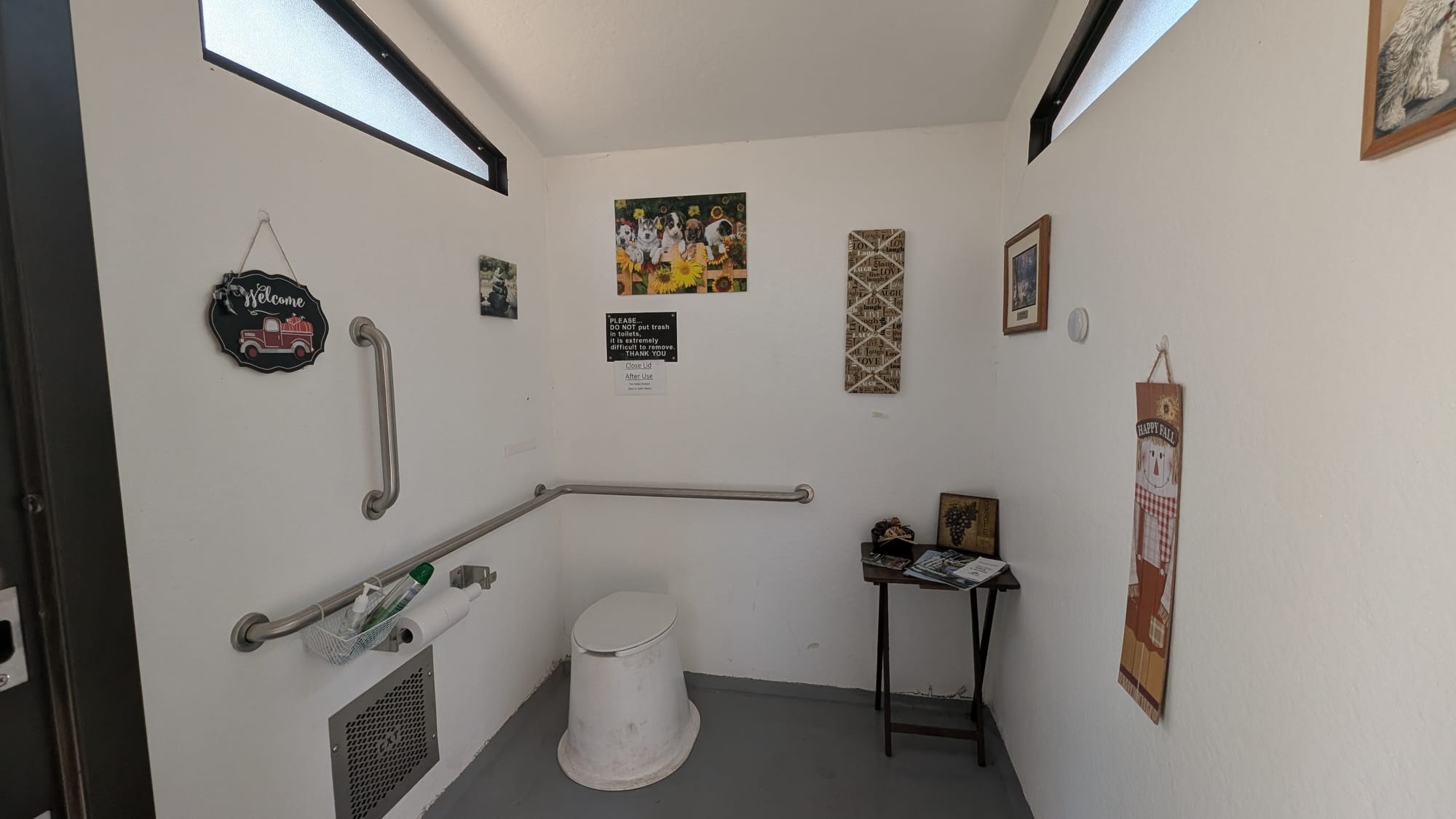 Clean and nicely decorated pit toilet at Eagle Lake campground, view from Pine Tavern Patio and prepared for possible thunderstorm at Maryhill